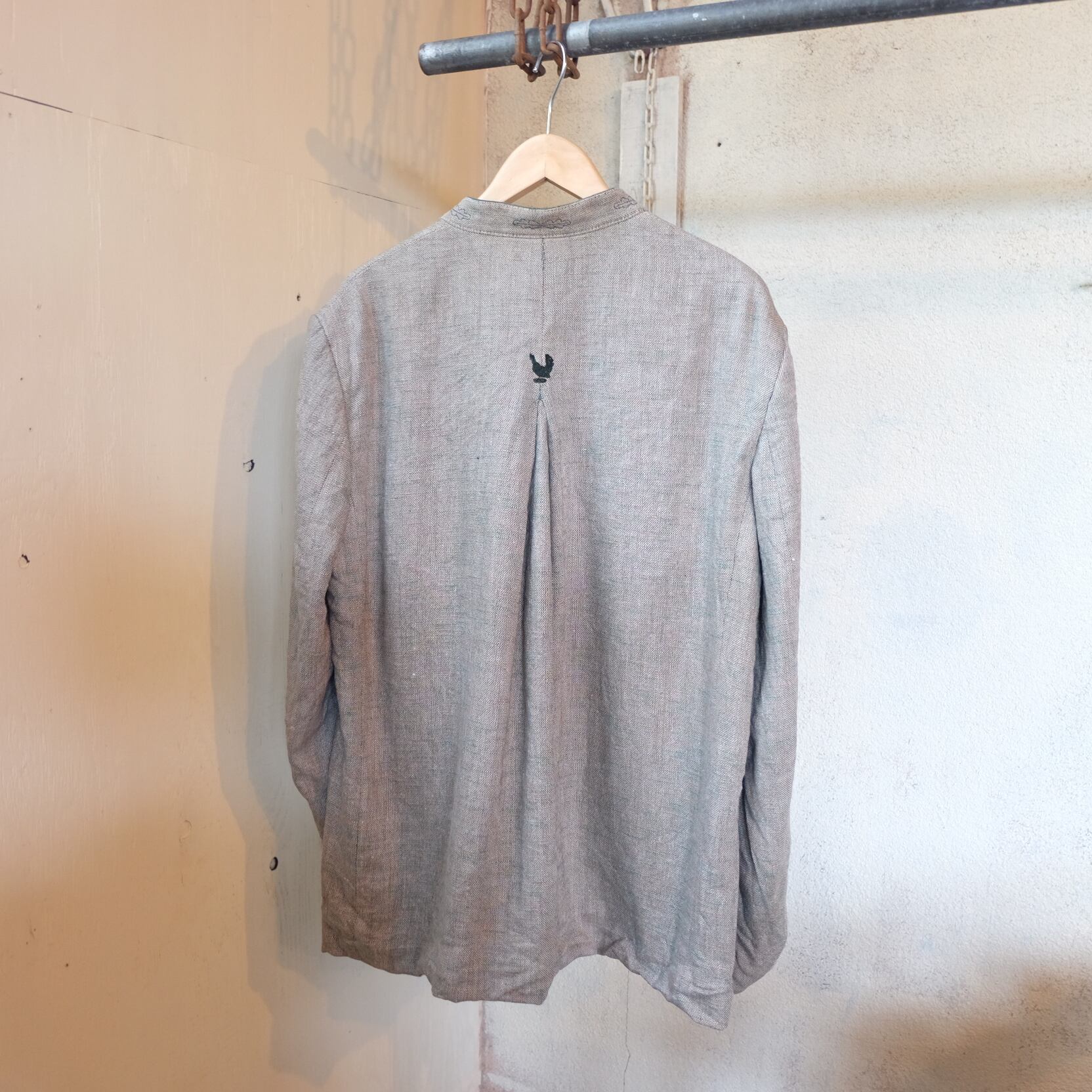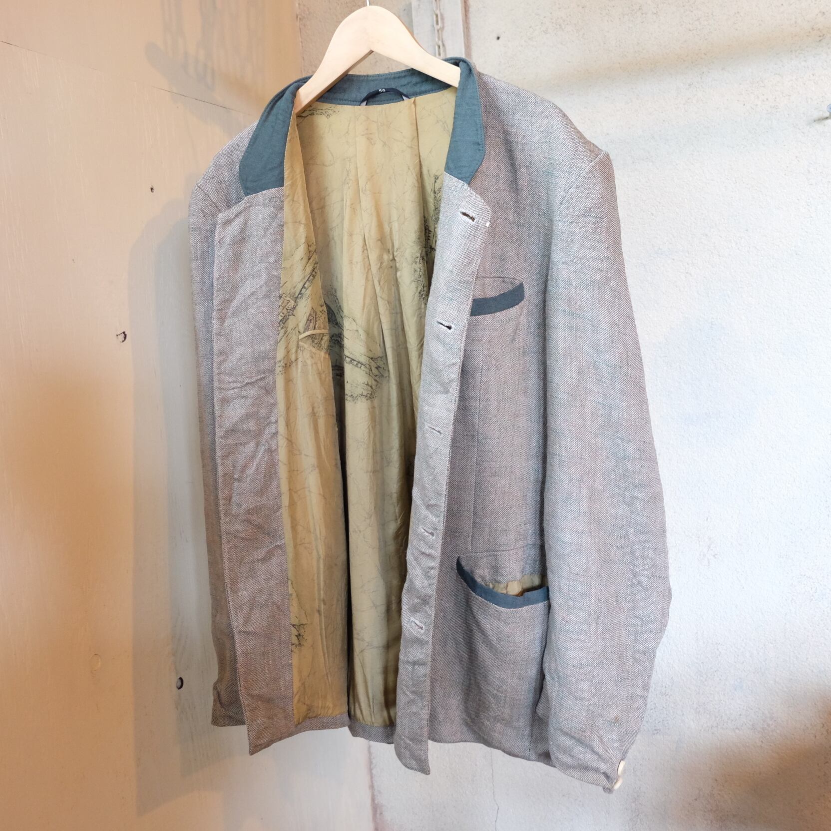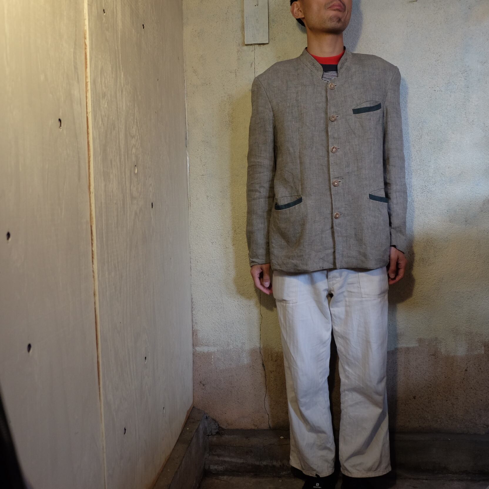 ジャケットが個性のあるアイテムなのでボトムはシンプルなアイテムなどが合わせやすく様々なモノと相性が良いかと思います。