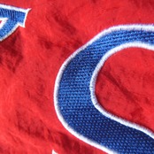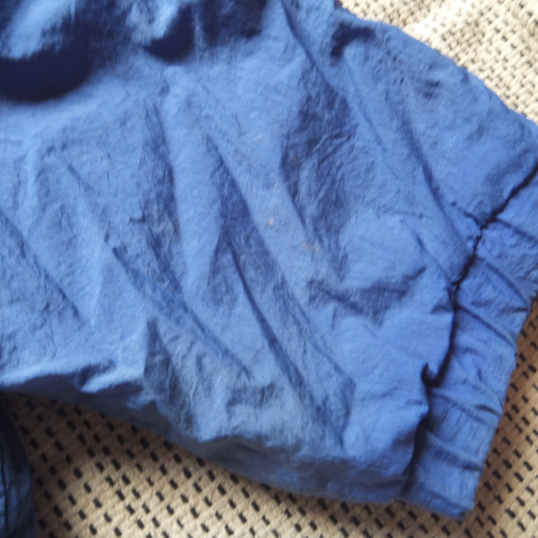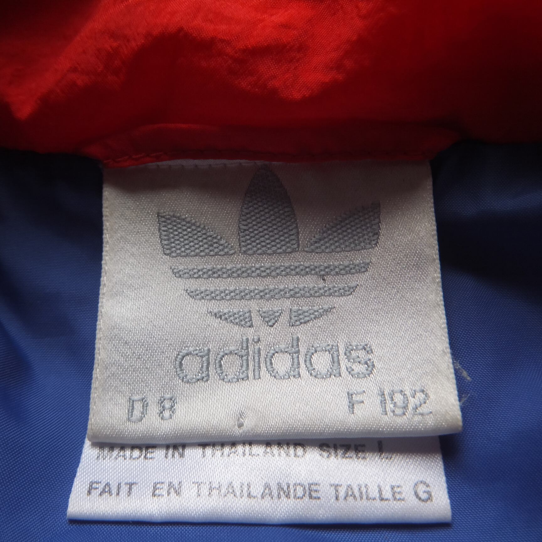 赤と青のツートンカラーのナイロンジャケット。